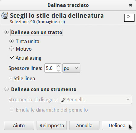 - Nella finestra Delinea tracciato che comparirà potrai personalizzare il tipo e lo spessore del tracciato, o fare clic direttamente su Delinea per utilizzare le impostazioni predefinite. Di default, il tratto assumerà il colore in primo piano di GIMP.