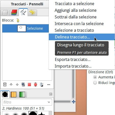 - A questo punto seleziona la scheda Tracciati dal pannello dedicato di GIMP, quindi fai clic con il pulsante destro del mouse sul nuovo tracciato (creato al punto 3) e seleziona la voce Delinea tracciato: